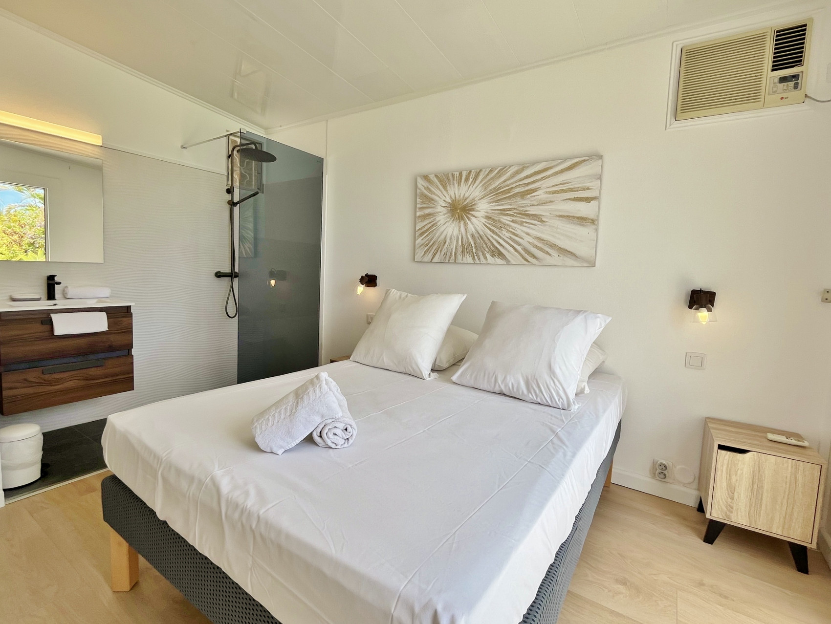✔️ 1 air-conditioned bedroom (160x200) with ensuite bathroom (indoor & outdoor shower)